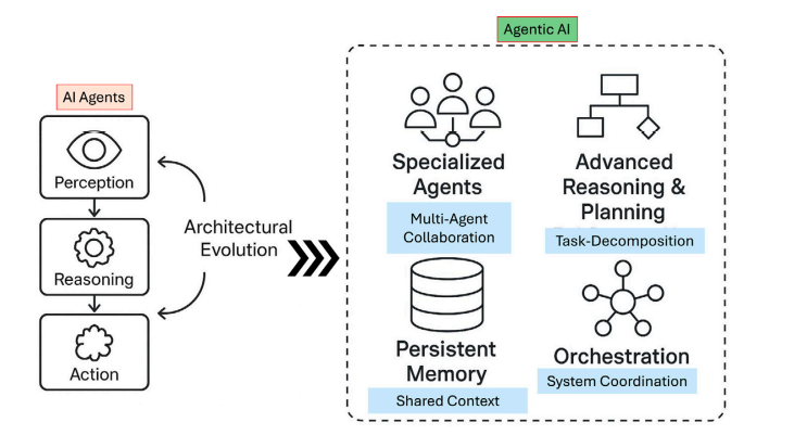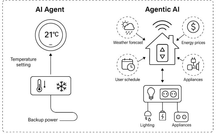 Agentic AI нь AI Агентуудын дараагийн шатны хувьсал бөгөөд энэ нь нэг биш, харин олон мэргэшсэн агентууд хамтарч ажиллах замаар цогц зорилгыг биелүүлдэг систем юм. Үүнийг ухаалаг гэрийн системээр жишээ авбал: нэг термостат (AI Агент) зөвхөн температурыг зохицуулдаг бол Agentic AI систем нь цаг агаарын урьдчилсан мэдээ, эрчим хүчний үнэ, хэрэглэгчийн хуваарь зэргийг харгалзан гэрийн бүх төхөөрөмжийг нэгдсэн байдлаар удирдана.