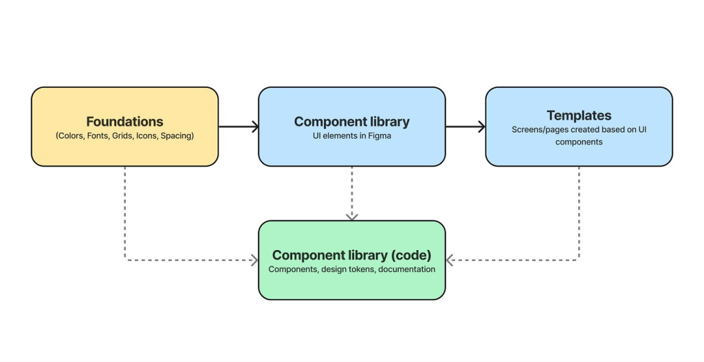 Design System нь ихэвчлэн Design Tokens, Component Library, Guidelines, Documentation гэсэн үндсэн хэсгүүдээс бүрддэг. Design Tokens нь өнгө, хэмжээ, spacing, font зэрэг визуал параметрүүдийг код болон дизайн аль алинд нь ашиглах боломжтой стандартаар тодорхойлдог. Component Library нь button, input, card, modal зэрэг дахин ашиглах боломжтой UI элементүүдийг багтаадаг бөгөөд энэ нь хөгжүүлэлтийн үр ашиг, кодын чанарыг сайжруулдаг. Харин Guidelines болон Documentation нь хэрэглэгчийн урсгал, accessibility, interaction design зэрэг дүрэм журмыг тодорхойлж, багийн гишүүдийн ойлголтыг нэгтгэдэг. Эдгээр бүрэлдэхүүн хэсгүүд нь системийн scalability болон maintainability-г дэмждэг.