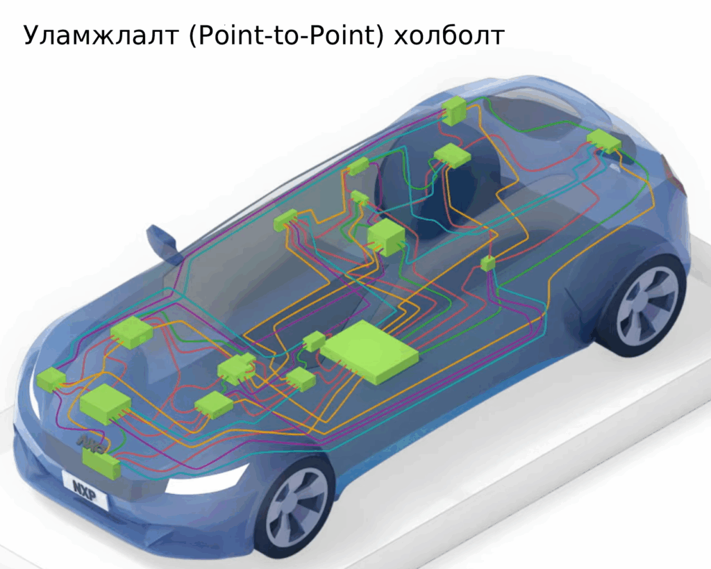 - Message-Based (Зурваст суурилсан): Үүний оронд, хүмүүс өөрийн мэдээллийг зүгээр л “зарладаг”. Жишээ нь, жолоочийн хаалганы модуль (ECU) “ЦОНХЫГ ХААХ КОМАНД, ID: 123” гэж өрөөнд ярина.