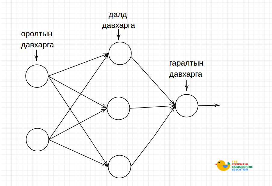 - Гаралтын давхарга: Тухайн ньюроны гаралт нь эцсийн хариу болж гардаг.