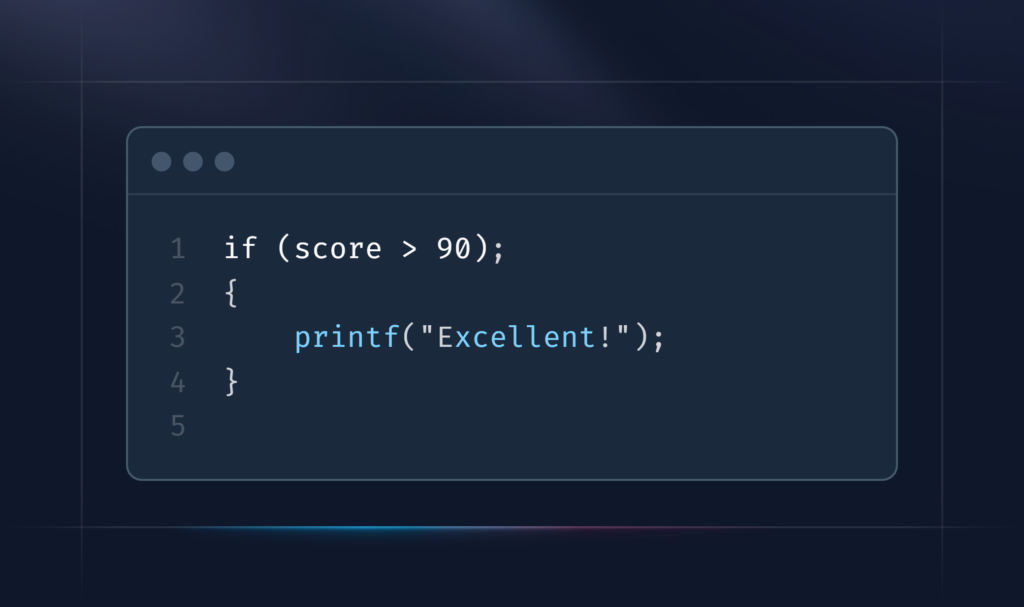 Энд if-ийн дараах semicolon нь нөхцөлийг тасалдуулж, printf үргэлж ажиллана. Энэ нь “багш чинь шалгалтын оноо шалгахын оронд бүх хүнд ‘100 авсан’ гэж хэлчихэж” байгаатай адил.