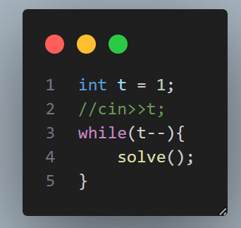 Одоогоор хоосон, гэхдээ өрсөлдөөнт програмчлалын үед олон даалгаврыг нэг кодонд шийдэхэд тус бүрт нь solve() гэж нэрлэсэн функц ашиглана.