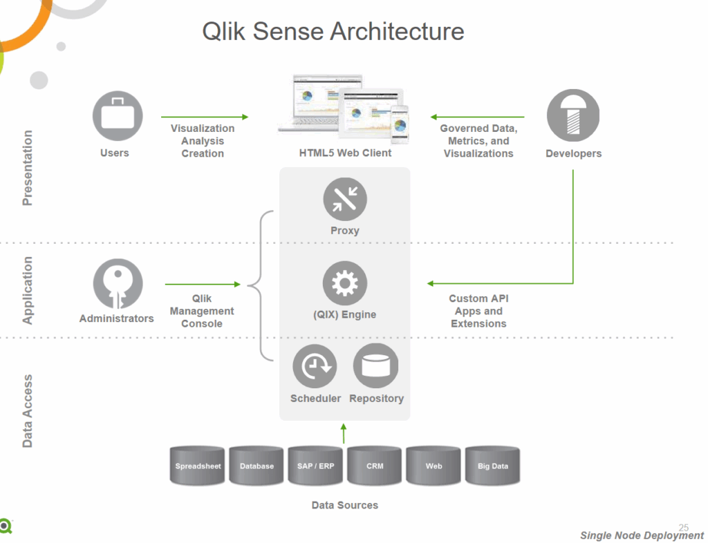 Qlik Sense нь Client–Server загварт суурилсан ухаалаг өгөгдлийн шинжилгээний систем бөгөөд архитектурын хувьд гурван үндсэн давхаргад хуваагддаг. Эхнийх нь өгөгдлийн давхарга буюу Data Layer юм. Энэ давхаргад систем Excel, CSV, SQL сервер, Oracle болон cloud платформ зэрэг олон төрлийн өгөгдлийн эх үүсвэртэй холбогдож, мэдээллийг нэг дор татаж авдаг. Ингэж нэгтгэсэн өгөгдөл дараагийн шат болох Qlik Associative Engine рүү дамждаг. Хоёр дахь нь аппликейшний давхарга буюу Application Layer бөгөөд энэ нь Qlik Sense-ийн үндсэн боловсруулалтын хэсэг юм. Associative Engine нь өгөгдлийг in-memory хэлбэрээр боловсруулж, хэрэглэгчийн хийсэн сонголт бүрийг бодит цагт тооцоолж, өгөгдлийн уялдаа холбоог илрүүлдэг. Ингэснээр хэрэглэгч SQL асуулга бичихгүйгээр өгөгдлийн хоорондын хамаарлыг шууд харж чаддаг. Сүүлийнх нь харагдацын давхарга буюу Presentation Layer юм. Энэ хэсэгт хэрэглэгчийн ажилладаг интерфэйс ордог бөгөөд Qlik Sense Hub, график, dashboard, Insight Advisor зэрэг хэрэгслүүдийг ашиглан өгөгдлөө шинжилж, drag and drop аргаар визуалчлал үүсгэх боломжтой. Мөн Insight Advisor нь хиймэл оюунд суурилж, хэрэглэгчийн асуултад тохирсон анализ, зөвлөмжийг санал болгодог.